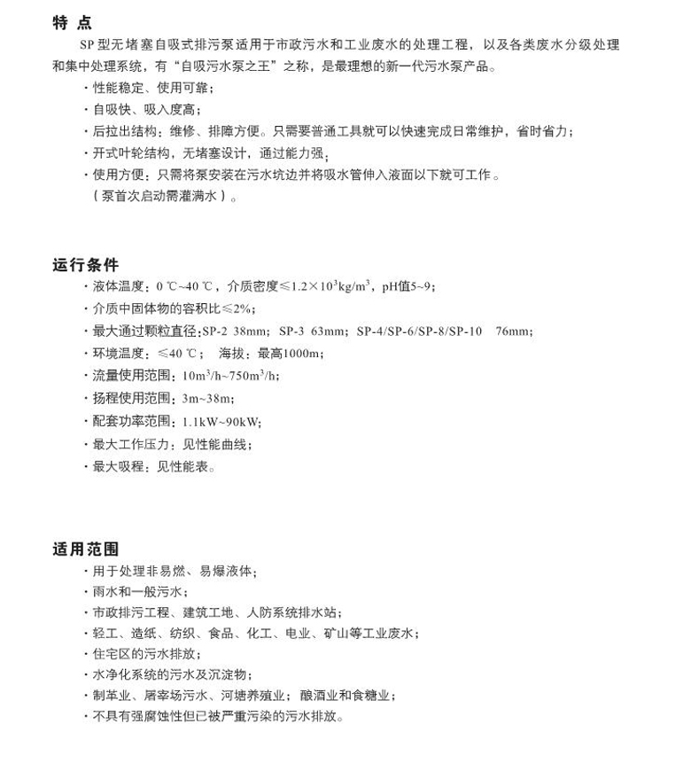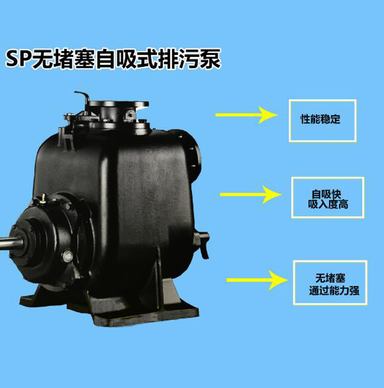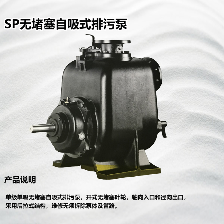產品說明:南方sp單級單吸無堵塞自吸式排污泵,開式無堵塞葉輪,軸向入口和徑向出口,采用后拉式結構,維修無須拆除泵體及管路。