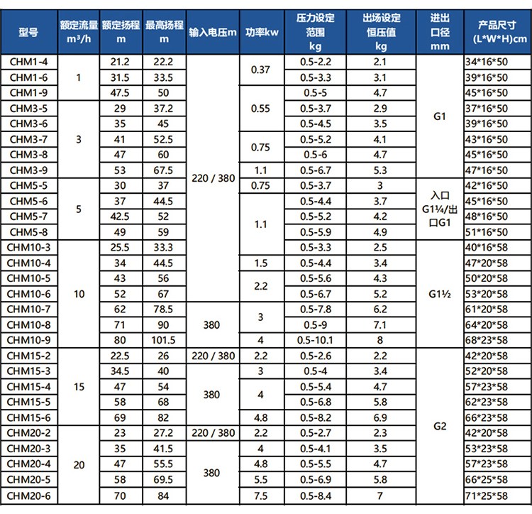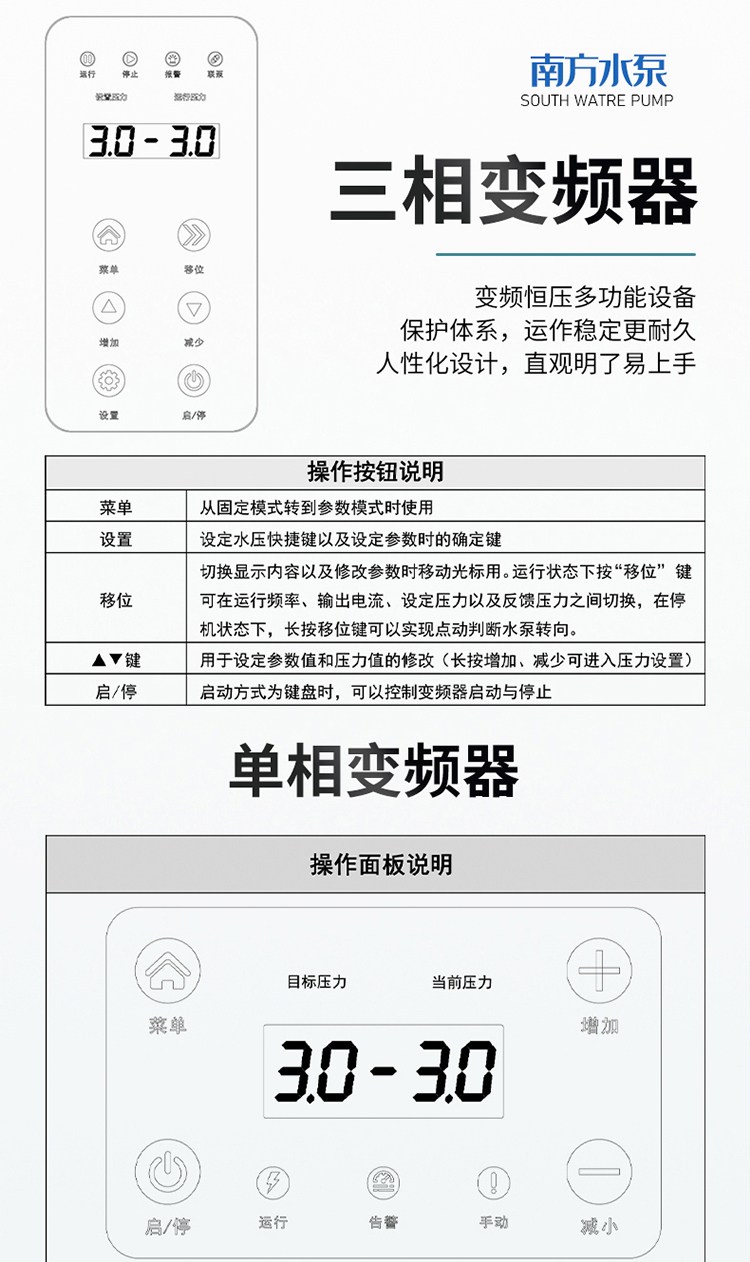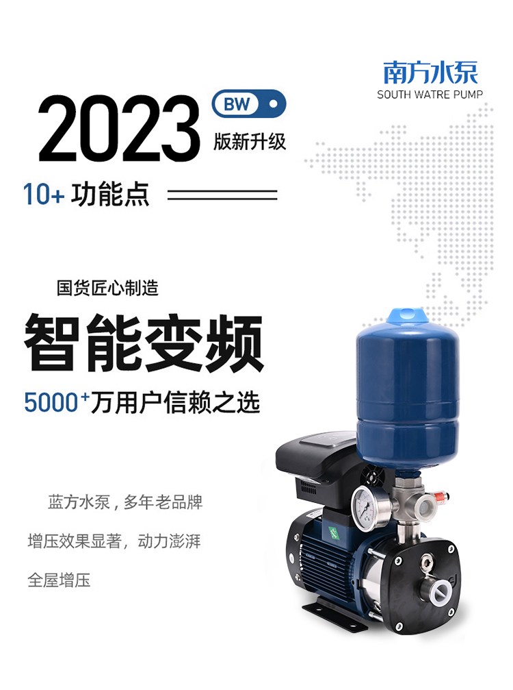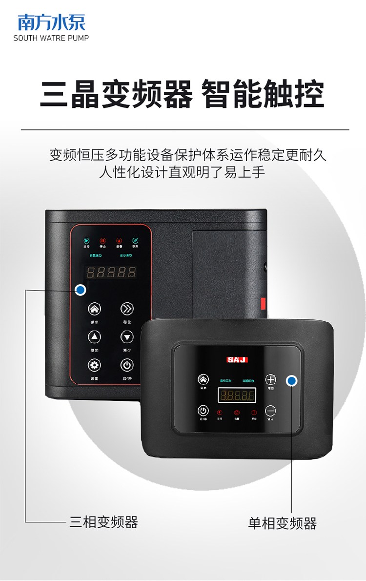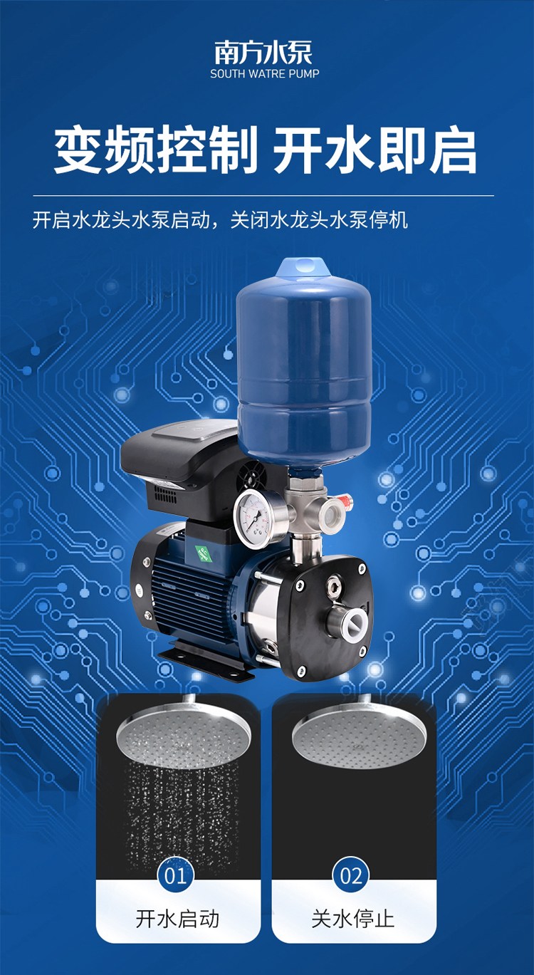 南方CHME系列臥式智能恒壓變頻泵采用了變頻調(diào)速及自動化控制相結(jié)合的技術(shù),配合高效節(jié)能的CHM非自吸輕型臥式多級離心泵。整機主要由CHM泵、控制器、傳感器、壓力罐、五通止回閥及軸向抗震壓力表等組成。具有性能穩(wěn)定、高效節(jié)能、全自動智能控制、低噪音、耐腐蝕、結(jié)構(gòu)緊湊、外形美觀、體積小、重量輕等特點。